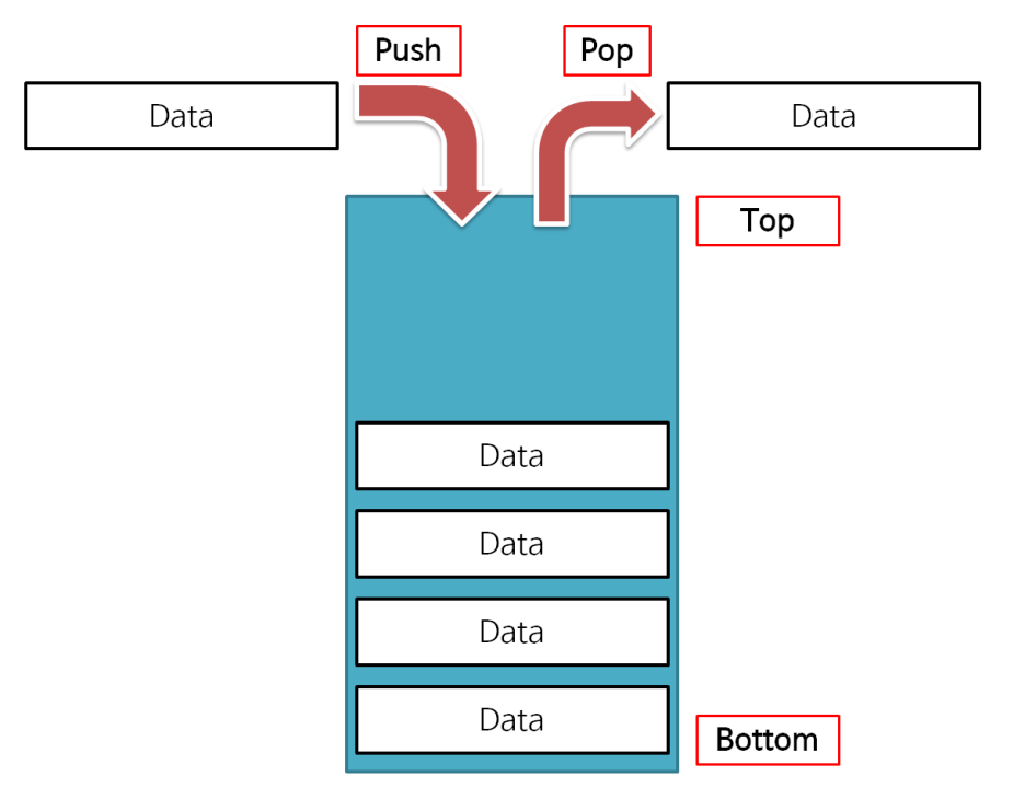 - 따라서, 가장 먼저 들어온 데이터가 가장 늦게 사용되고, 가장 나중에 들어온 데이터가 가장 먼저 사용되는 후입선출(Last In First Out) 방식의 자료구조이다.