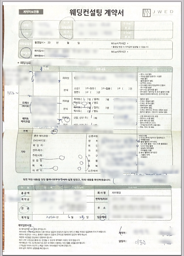 꼼꼼하고 세심한 예신님이 여러 업체를 알아본 결과(너무 미안하다 지금도... 결혼 준비를 예신님이 혼자 다 했다....) 우리가 나름대로 정했던 기준에 꼭 맞는 제이웨딩 '이은교 플래너'님과 계약을 완료할 수 있었다.