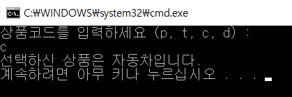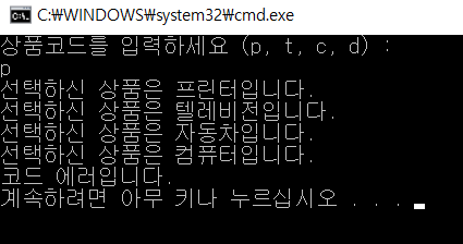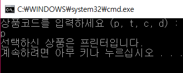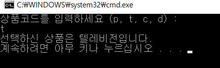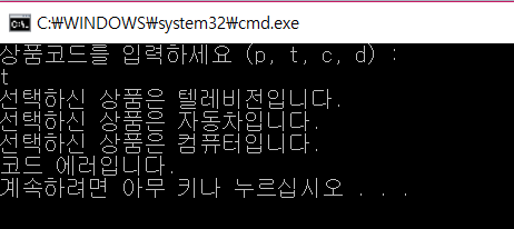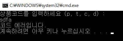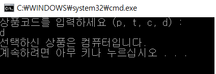 * 상품 코드 'p, t, c, d' 중에 하나를 입력하라는 메시지를 사용자에게 출력합니다.