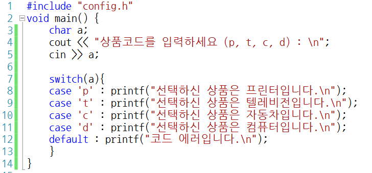 - swtich문에서는 (수식)의 결과 값과 case 다음에 나오는 값이 일치할 경우, 그 행으로 뛰어 넘어 문장을 수행하게 된다.