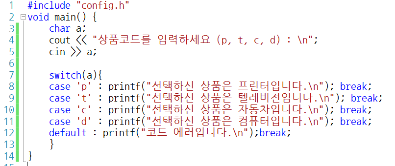 - default는 다음에 나오는 문장은 별도의 break 명령을 쓰지 않아도 자동으로 swtich문이 종료된다.