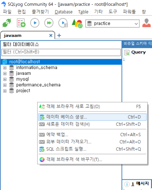 'CREATE DATABASE practice'는 'practice'라는 이름으로 데이터베이스를 형성하라는 의미입니다.