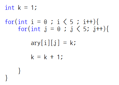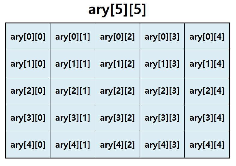 예를 들어, 5행 5열의 2차원 배열을 선언하기 위해서는 다음과 같이 코딩하면 되겠습니다.