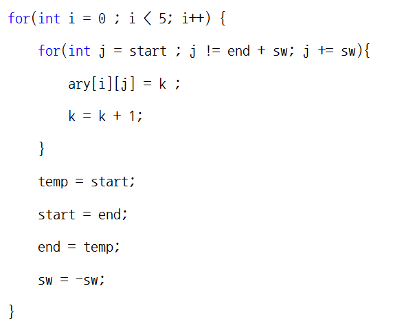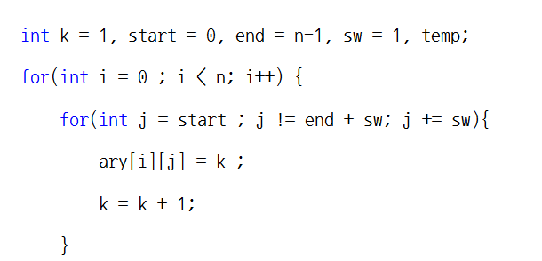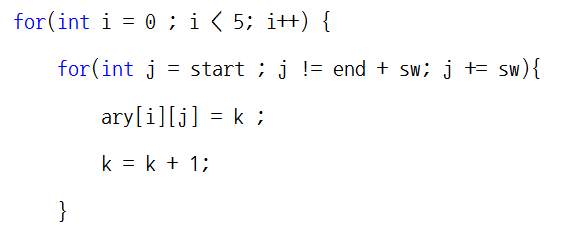 j는 열이 숫자를 증가시키냐 혹은 감소시키냐에 따라 start와 end의 값이 달라질 수 있도록 합니다.