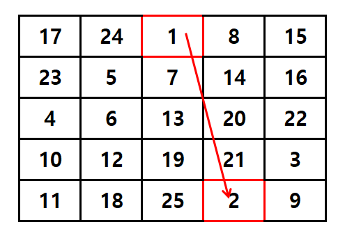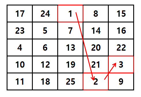 그 이유는 신기하게도 '숫자 ÷ 마방진의 크기'의 나머지가 0이 될 때마다 숫자를 채우는 방식이 아래 방향이 되요. 한 번 보실까요?