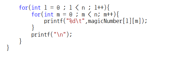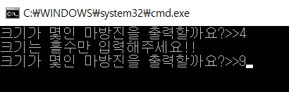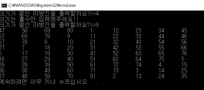이러한 상태로 조건 검사를 끝내고, 마방진을 출력해보도록 하겠습니다.