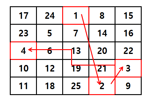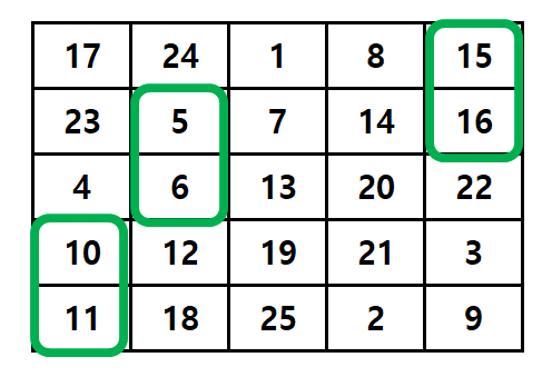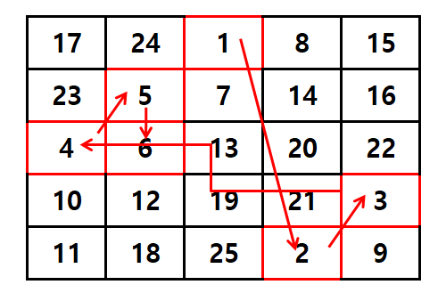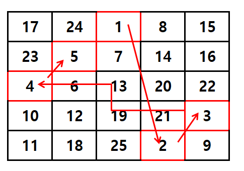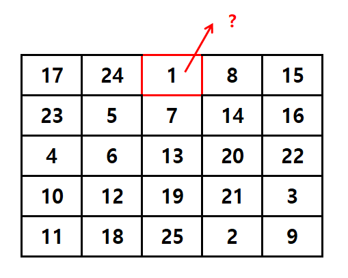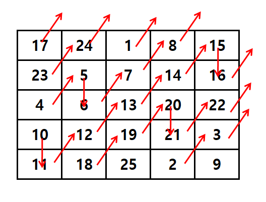 간단한 예로 5 * 5 마방진은 이렇게 생겼어요.