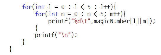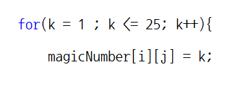 k는 5 * 5의 배열이므로 25까지 반복해주고, magicNumber[0][2]에는 1을 넣어줍니다.