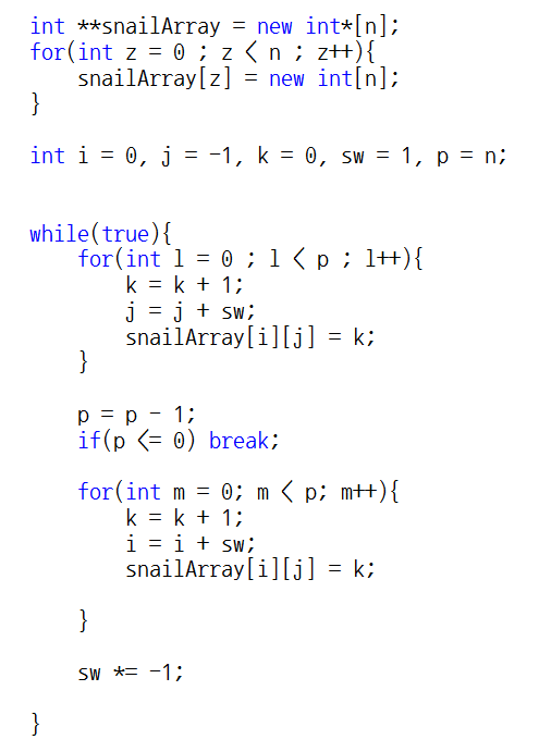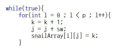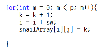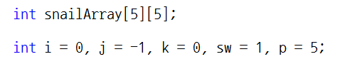 i는 행 인덱스, j는 열 인덱스, k 는 각 배열에 채워줄 숫자, sw는 방향이 바뀔 시 사용될 스위치 변수, p는 몇 번을 반복해야 하는지를 알려주는 '반복 인덱스'입니다.