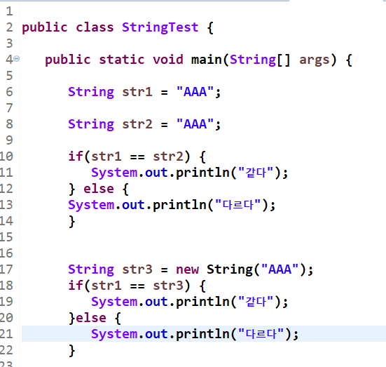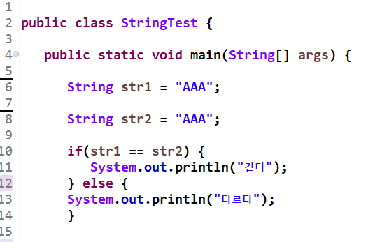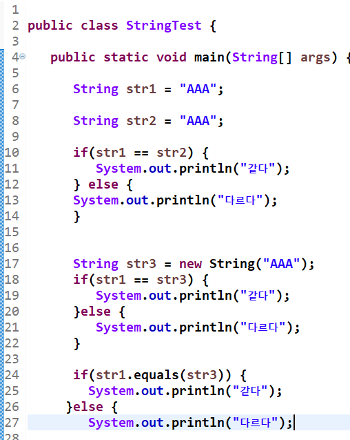 먼저 String이라는 class로 str1과 str2를 선언하고, 동일하게 "AAA"라는 값을 넣어줍니다.