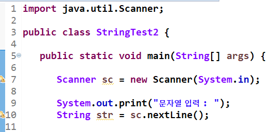 ① 자료를 입력 받는 Scanner Class의 객체 'sc'를 생성하고, 줄 단위의 문자열을 입력 받습니다.