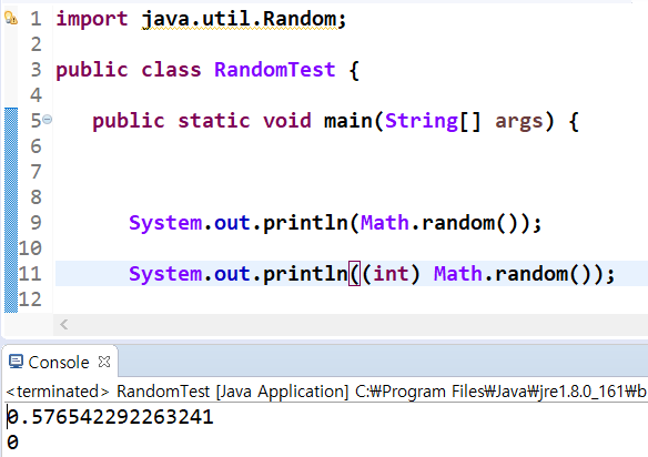 그런데 단순히 random 메소드를 호출하여 정수형으로 캐스팅만 하면 0이 나옵니다.
