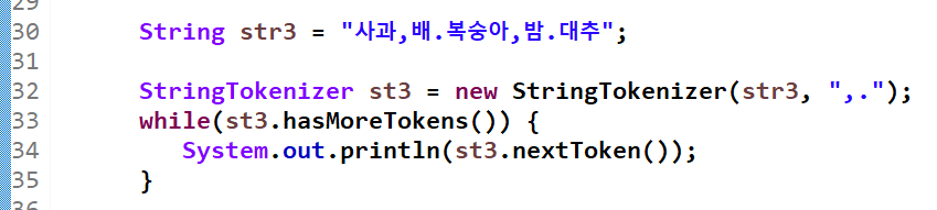 - 3번째 인수 생략시(false) 구분자는 토큰에 포함되지 않지만, 3번째 인수에 true를 입력하면 구분자도 토큰으로 취급한다.