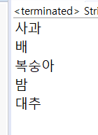 그 결과, "사과, 배, 복숭아, 밤, 대추"로 문자열이 나뉘어 출력되었습니다.