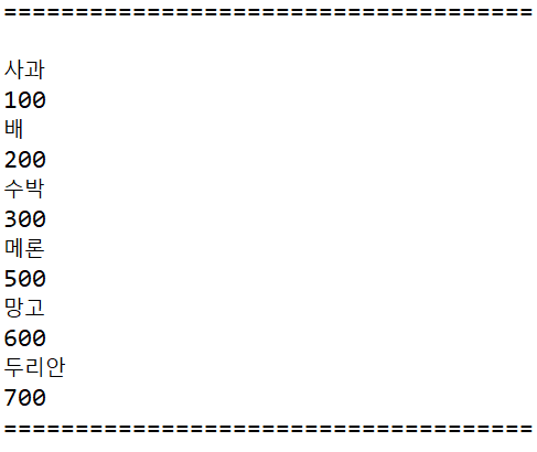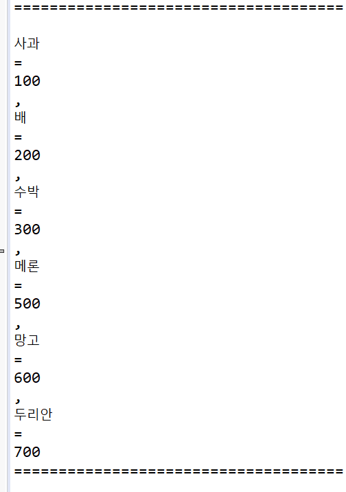 * "사과=100,배=200,수박=300,메론=500,망고=600,두리안=700"을 "문자열, =, 가격"으로 나누어 출력하는 소스코드입니다.