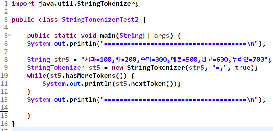 두 번째 소스 코드 : StringTokenizer st5 = new StringTokenizer(str5, "=,", false(생략 가능));