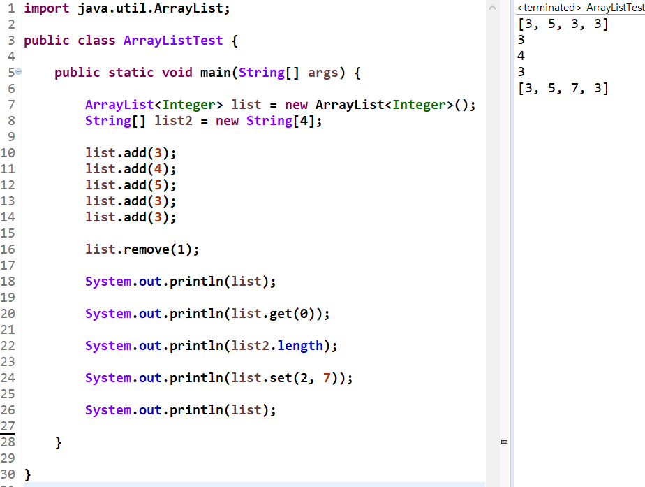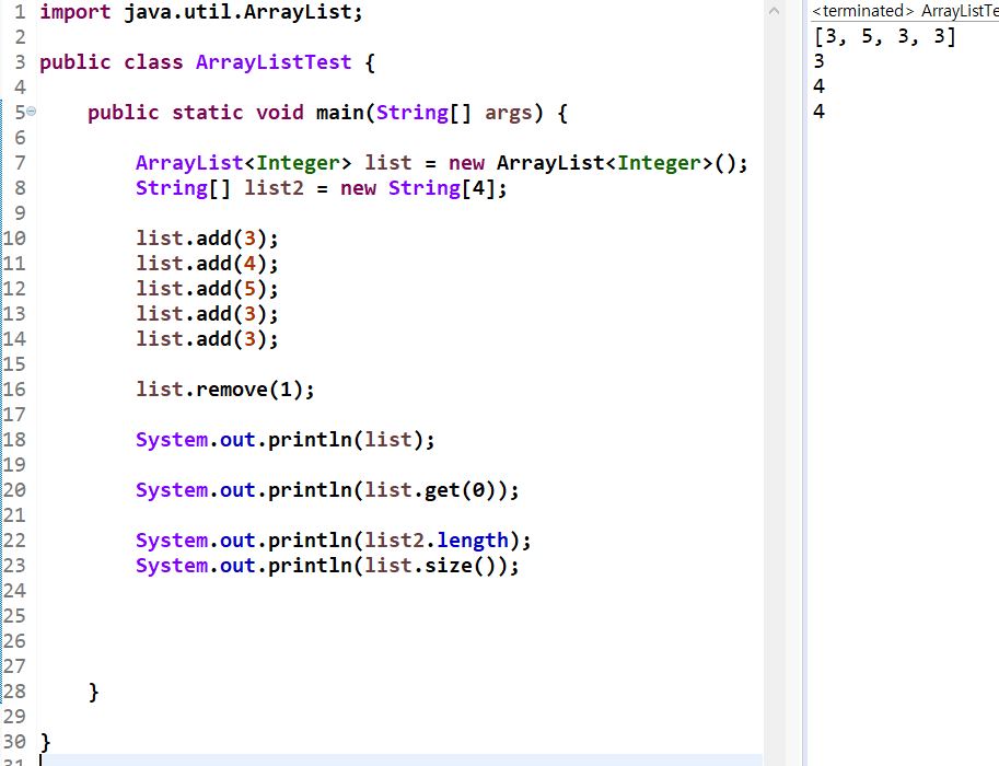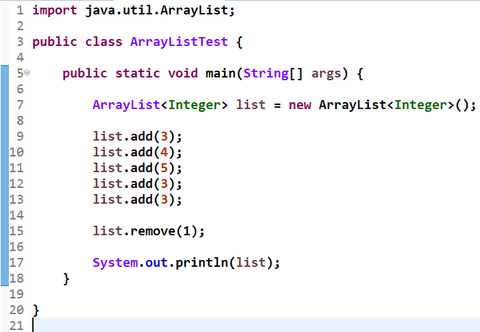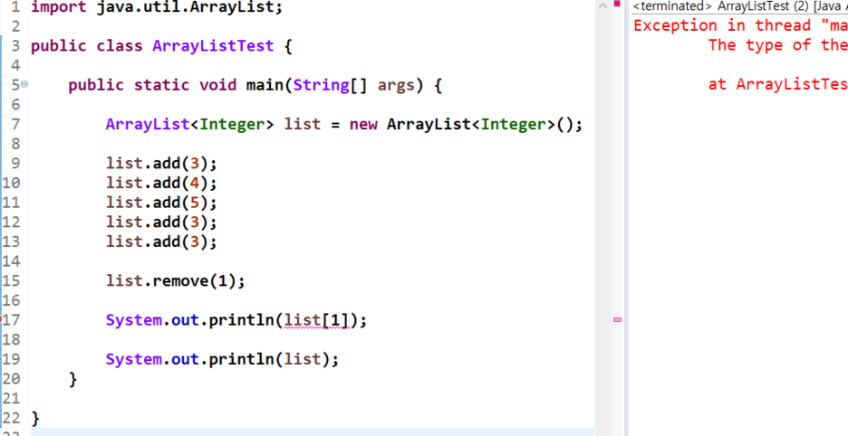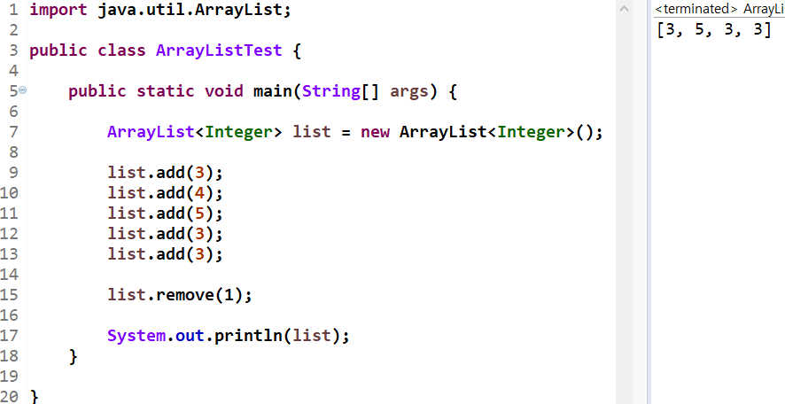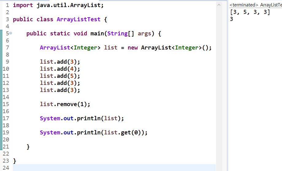 'list.remove(1)'은 [3,4,5,3,3]이었던 ArrayList 자료형 list에서 1번째 값인 '4'을 삭제하라는 의미입니다. 실행 결과, 제일 먼저 추가했던 4가 정상적으로 삭제되었습니다.