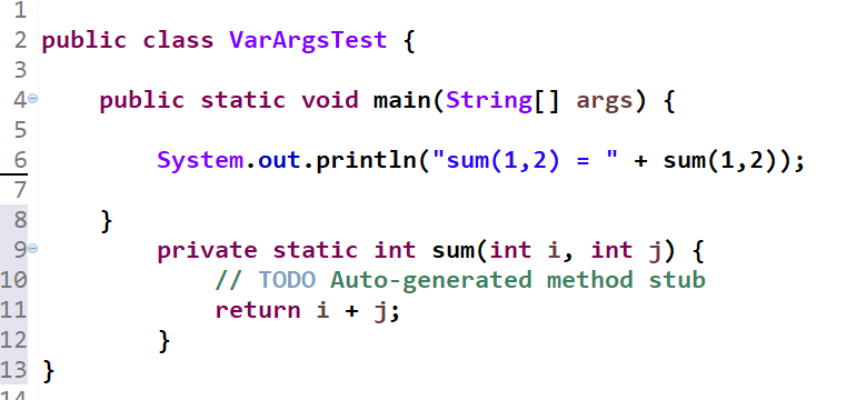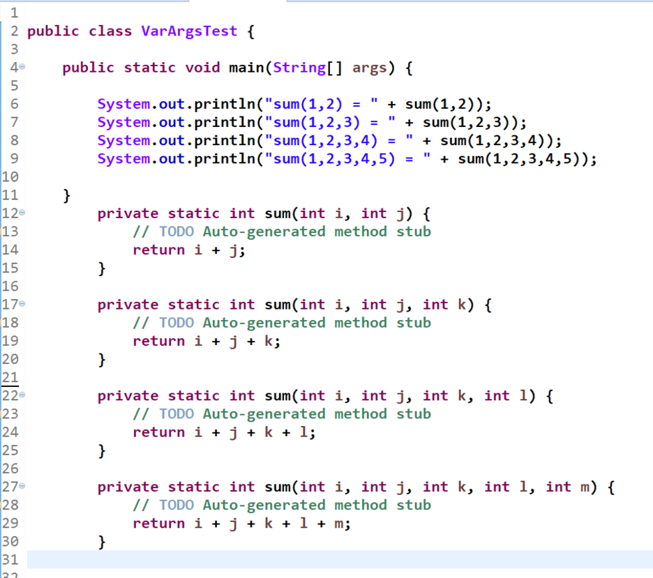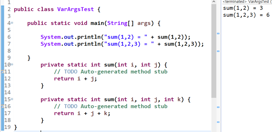 그래서 다시 3개의 정수형 변수를 인수로 입력 받는 sum이라는 메소드를 생성하고 실행하였습니다.