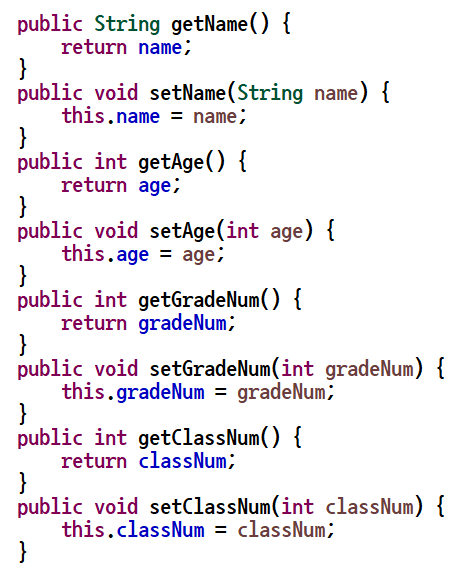 일반적인 Class의 모습처럼 name, age, gradeNum, classNum이라는 멤버 변수와 기본 생성자,
