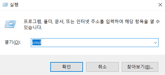 windon 버튼 + R, 실행창에 'cmd'라고 입력.