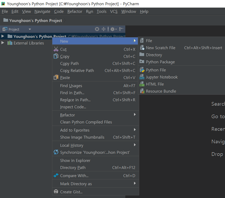 왼쪽 디렉토리에는 제가 지정한 프로젝트명이 나타나고, 파이참 사용에 관한 팁도 함께 팝업됩니다.