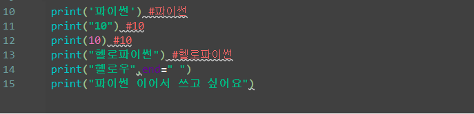 다만 주석 영역을 확실히 표시하기 위해서는 열었던 홑따옴표, 쌍따옴표는 반드시 닫아줘야 하겠습니다.