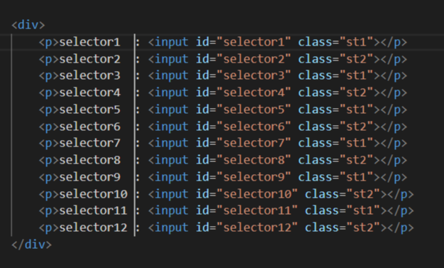 'st1'이라는 클래스를 사용하는 id는 selector1, 3, 5, 7, 9, 11이었으므로,