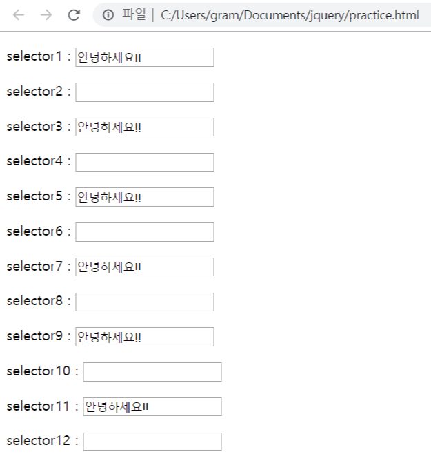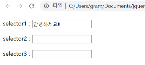 'selector1'이라는 아이디를 가진 input 박스에 "안녕하세요"라는 값을 넣어보겠습니다.