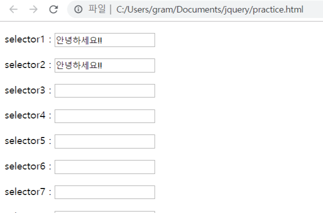 저는 아이디가 selector1, selector2인 요소들을 선택하여 값을 "안녕하세요!!"로 설정해보겠습니다.