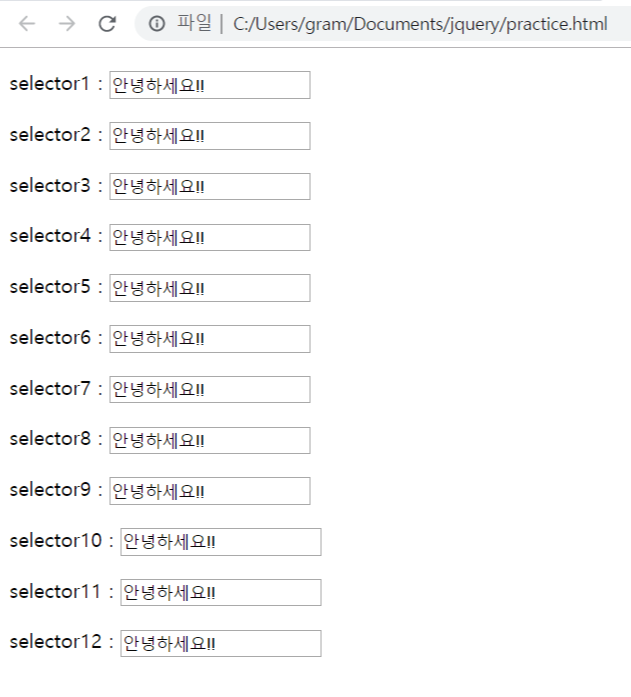 전체 선택자를 사용하여 모든 요소의 값을 '안녕하세요!!'로 넣어보겠습니다.