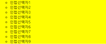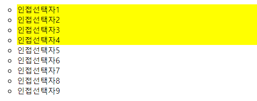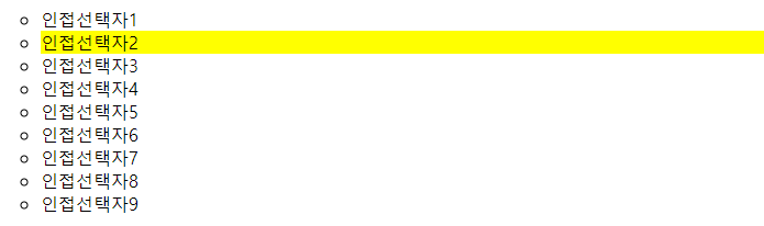 'temp1' 클래스를 사용하는 <li> 태그의 다음 요소 선택자인 '인접선택자2'에만 노란색 배경이 적용되었습니다.