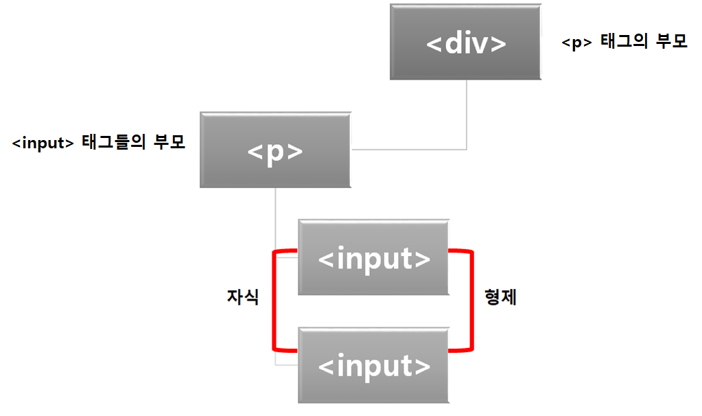 여기서 한 단계 더 들어가면, 두개의 <input> 태그는 서로 형제 요소 관계가 되는 것입니다.