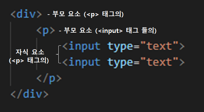 이 코드에서 <div> 태그와 <p>태그, <p> 태그와 <input> 태그는 서로 부모와 자식 요소 관계가 됩니다.