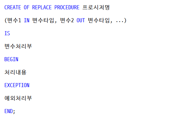- 말 그대로 프로시저명이 있으면 기존 프로시저를 대체하고, 없으면 새로 생성하라는 의미이다. 프로시저의 이름을 정의하거나 수정하는 부분으로 보면 된다. 즉, 프로시저 선언부.