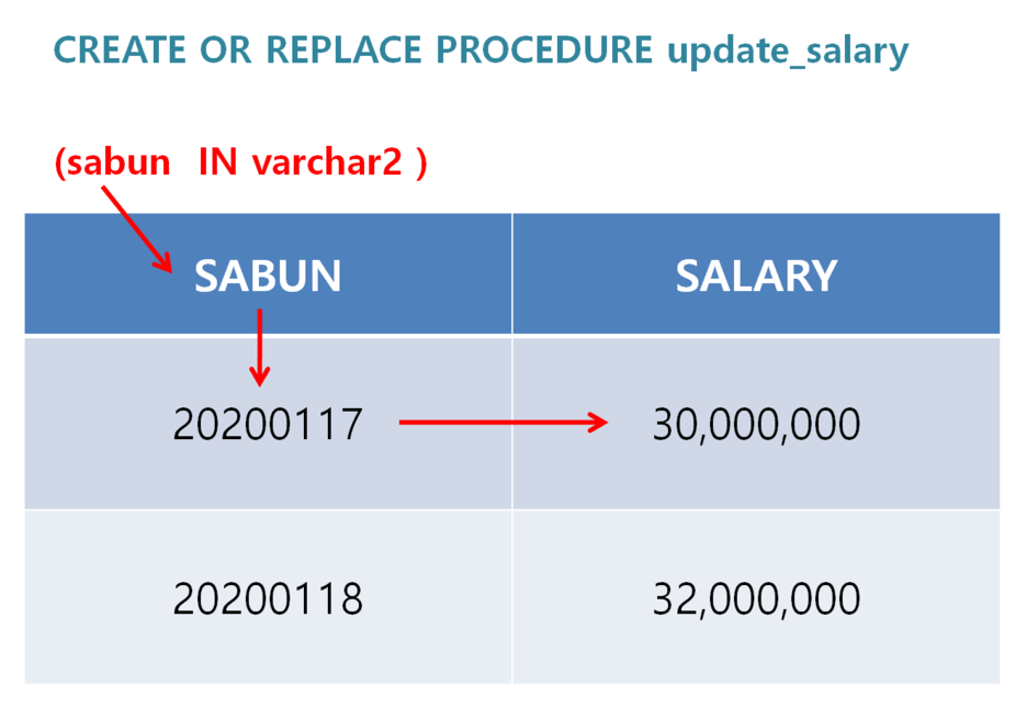 예를 들어, 한 회사의 급여 정보를 저장하고 있는 테이블이 있다고 가정하자. 이 테이블의 Primary Key는 SABUN(사번)이 되는데, 사번을 입력받아 해당하는 사원의 급여를 1.3배로 update 하는 프로시저를 작성하고자 한다. 이때, 정상적인 프로시저 실행을 위해서는 사용자로부터 '사번'을 입력받아야 하는데, 이 '사번'이 매개변수가 된다.