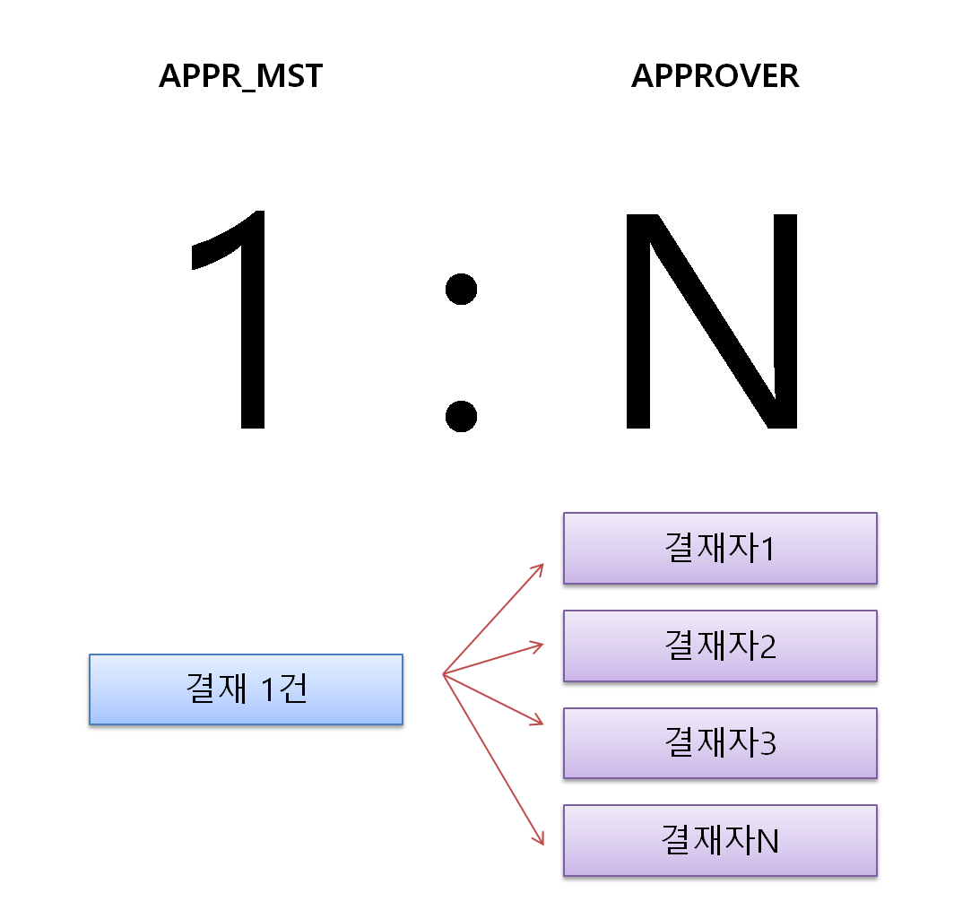 INSA 테이블은 단순히 사번을 가지고 이름을 조회하는 용도로만 사용될 예정이기에 배제하고, 아래 그림과 같이 APPR_MST 테이블과 APPROVER 테이블의 관계를 살펴보면 1 : N 관계임을 알 수 있다. 결재 1건당 다수의 결재자가 있을 수 있기 때문이다.