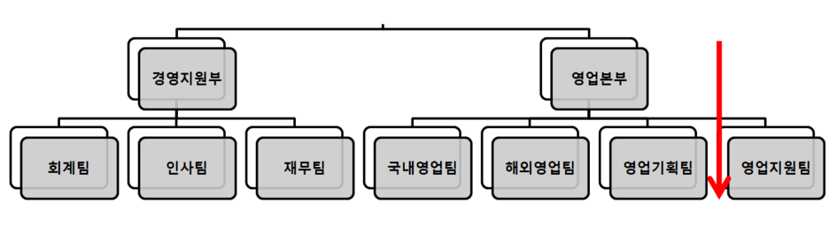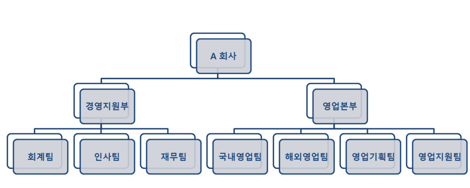 위 회사 조직도는 최상위에 A 회사를 중심으로 경영지원부, 영업본부로 나뉜다. 그리고 경영지원부는 다시 회계팀, 인사팀, 재무팀, 영업본부는 국내영업팀, 해외영업팀 등으로 나뉜다. 이때, 회계팀, 인사팀, 재무팀의 부모 부서는 경영지원부가 된다. 거꾸로 회계팀, 인사팀, 재무팀은 경영지원부의 자식 부서가 된다(영업본부도 동일한 구조이므로 설명 생략).
