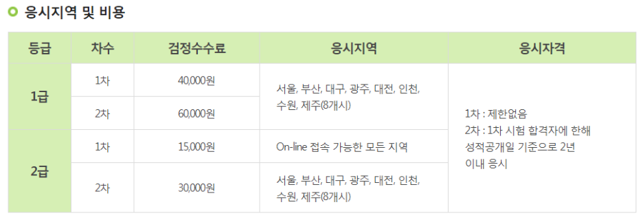 - 1급의 1차 시험의 응시료는 4만원, 2차는 6만원으로 싼 편(?)은 아니다. 시험 삼아 봐도 되지만... 그냥 한 번에 붙는 게 젤 좋은 것 같다.