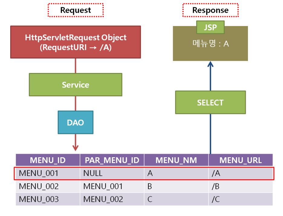 웬만한 프로그램의 메뉴 리스트도 대부분 DB에서 관리하고 있다. 메뉴 정보를 담고 있는 테이블은 상/하위(부모/자식) 메뉴의 계층형 구조이며, 각 메뉴가 프로그램에서 어떤 url로 관리되고 있는지도 저장된다. HttpServeletRequest 인터페이스의 getRequestURI() 메서드를 활용하면 클라이언트가 어떤 url로 요청했는지 쉽게 확인할 수 있고, 이를 파라미터로 받아 해당 메뉴의 상세정보(메뉴명, table 내에서 관리되고 있는 메뉴 ID)를 select 해 올 수 있다.