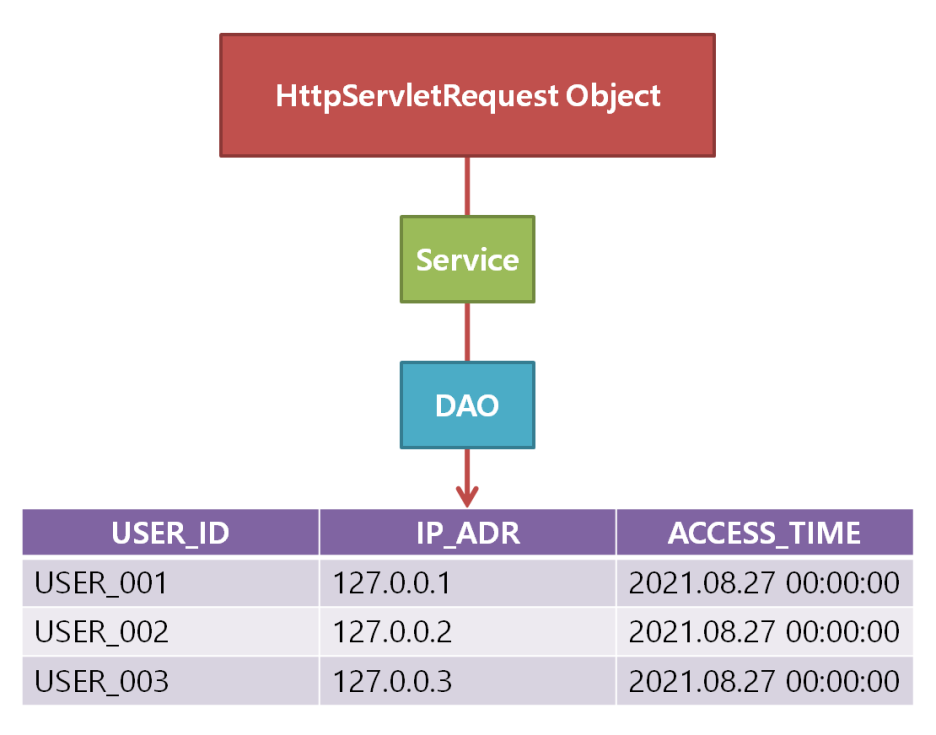 HttpServletRequest 인터페이스를 활용하면 클라이언트가 어떤 메뉴, 어느 시각에 접근했는지를 log로 남길 수 있다. 여기서의 log는 spring 자체의 log(Apache log4j)로 단순히 console 출력이 될 수도 있고, 개발자가 구성해놓은 DB Table에 하나의 record가 될 수도 있다. 대체로 로그인한 사용자 정보, 클라이언트의 ip 주소, 접근 메서드(request.getRequestURI) 정도를 별도의 log 테이블로 구성한다. 단, 개발 중인 애플리케이션의 특징, 고객사의 현업 요건 등을 고려하여 테이블의 구조와 개수는 개발자와 DBA가 협의해야 하겠지만 말이다.
